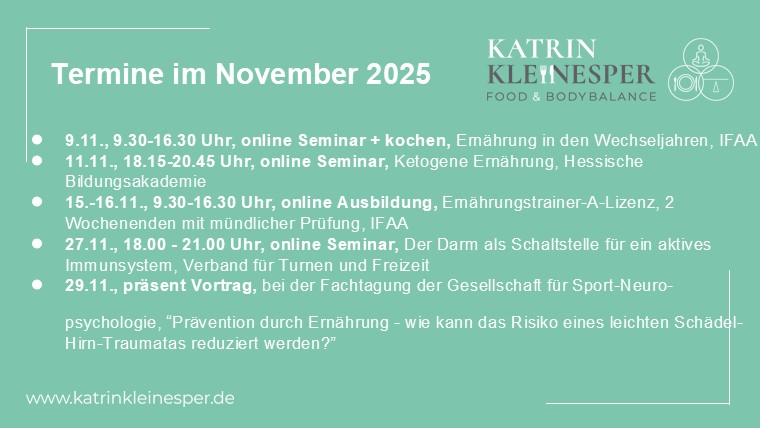 Der November fährt auf mit einem umfangreichen Programm, ob ein kurzes Seminar oder ne ganze Ausbildung zum Ernährungstrainer-A-Lizenz, eine Tagesfortbildung inkl. online Kochkurs und ich bin Referentin auf einer Fachtagung mit einem sehr sportartspezifischem Thema dabei: „Prävention durch Ernährung – wie kann das Risiko eines leichten Schädel-Hirn-Traumatas reduziert werden?” in Bad Honnef. Schau mal durch, wenn Dich was interessiert gibt es weitere Infos hier im Shop oder auf meinem Linktree auf meinem Instagram Kanal katrin_kleinesper – ich freue mich auch Dich.